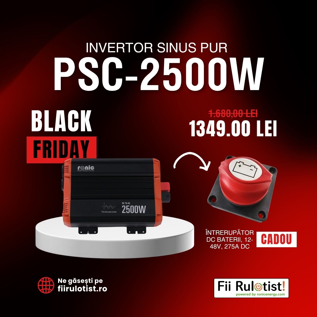 - Pachetul contine: invertor 12V cu sinus PUR RONIC KSC-2500W, cablu de conexiune cu papuci cupru Ø8mm pentru conectarea la terminalele “+” si “-” ale invertorului cat si in partea opusa pentru conectarea la bornele bateriei.