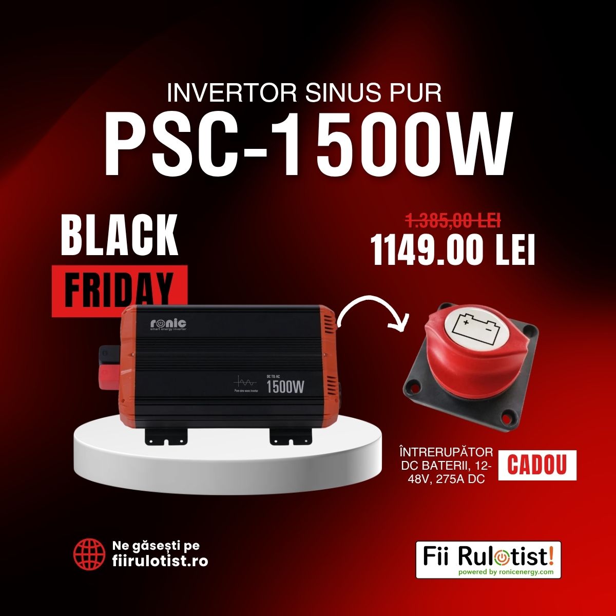 INVERTOR SINUS PUR PSC-1500W + CADOU Intrerupator DC baterii, 12-48V, 275A DC